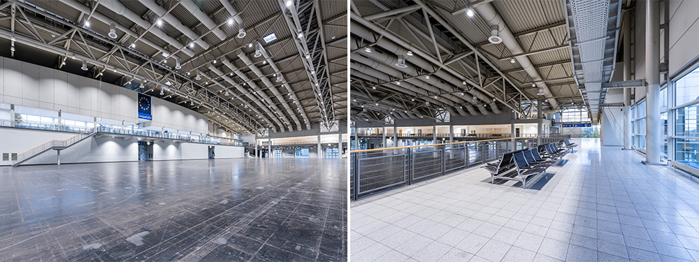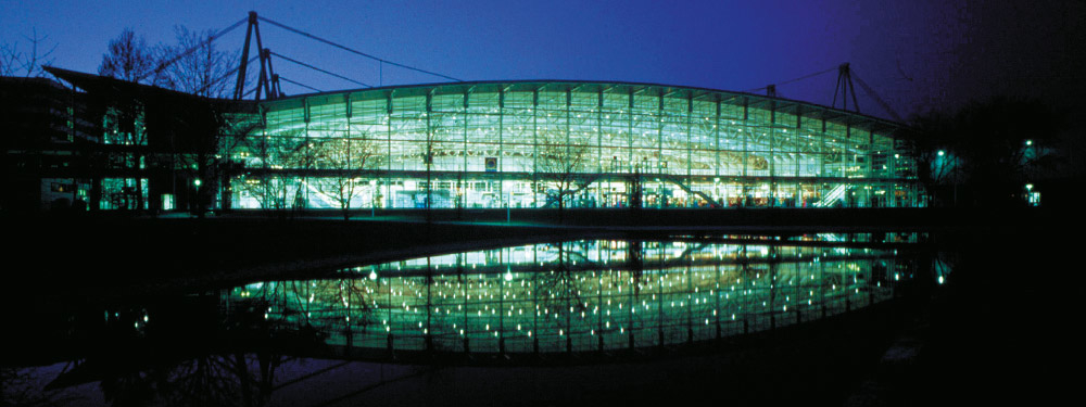 Das leicht gewölbte Dach, über Pylone abgespannt und 120m freitragend, beschirmt mit seitlicher Auskragung die ca. 17.000qm große multifunktionale Ausstellungs- und Veranstaltungsfläche. Die komplett verglaste, glatte Fassade macht das Messegeschehen innen und außen gleichermaßen erlebbar.