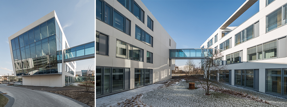 Am städtebaulichen Schnittpunkt von Verwaltung, College und Parkhaus entstand der Haupteingang des Werkscampus mit zweigeschossiger Empfangshalle und Ausstellungsbereich. Das viergeschossige Gebäude präsentiert sich zur Straße als Gruppe gegeneinander versetzter Weißbetonriegel. Im Erd- und zweiten Obergeschoss verkürzen Verbindungsgänge die Wege und fördern die Kommunikation. Die Büroflächen für 650 Mitarbeiter sind als Open Space konzipiert. Das barrierefreie Gebäude im KfW-55 Standard ist nach DGNB zertifiziert. In einem zweiten Bauabschnitt vollendet ein weiterer viergeschossiger Riegel das bauliche Ensemble nach Süden.